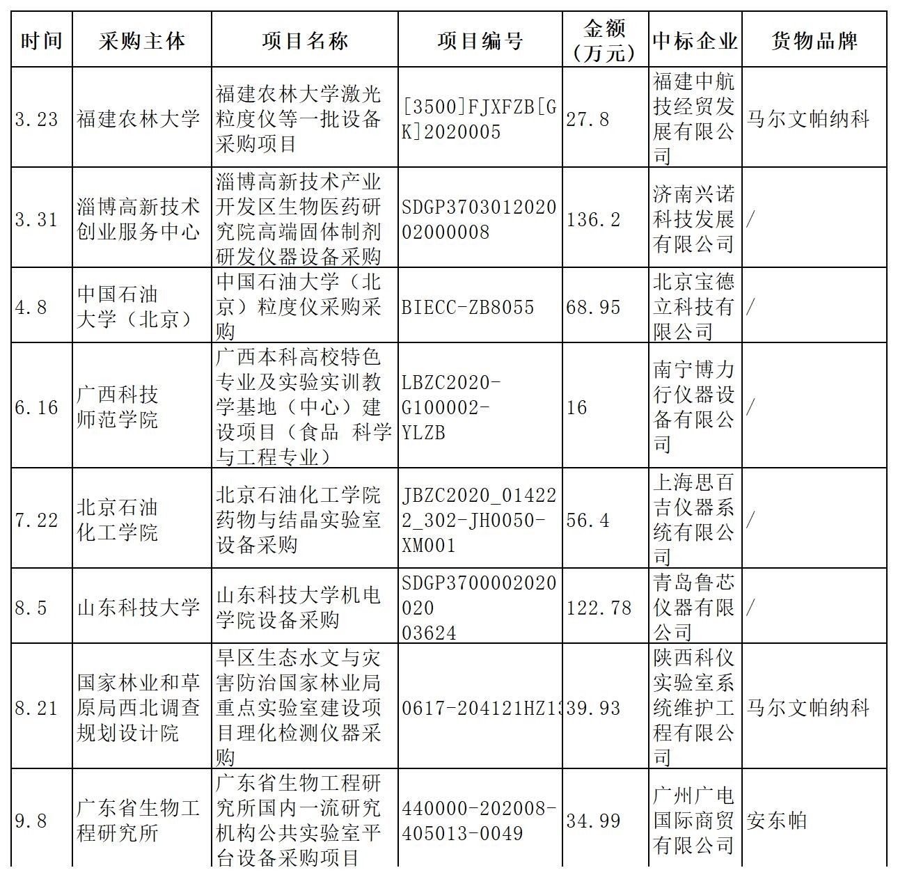 此外,從中標(biāo)品牌來看,2020年電粒度儀采購兼具國產(chǎn)品牌和進(jìn)口品牌。18場(chǎng)中標(biāo)采購中,有10場(chǎng)公布了中標(biāo)貨物品牌,其中可窺見進(jìn)口品牌仍是市場(chǎng)寵兒,尤其是馬爾文帕納科、安東帕等老牌儀器廠商,“出境率”最高。而國內(nèi)歐美克等知名廠商也占有一定的市場(chǎng)份額。