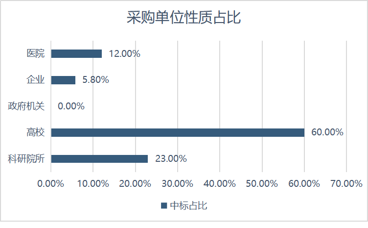 從采購(gòu)單位性質(zhì)的統(tǒng)計(jì)數(shù)據(jù)來(lái)看,高校成為采購(gòu)“高地”,占比為60%,與其次的科研院所拉開了較大的距離,醫(yī)院為12%,企業(yè)采購(gòu)相對(duì)薄弱,僅為5.8%,而政府機(jī)關(guān)在此輪統(tǒng)計(jì)中占比為0,較為少見。