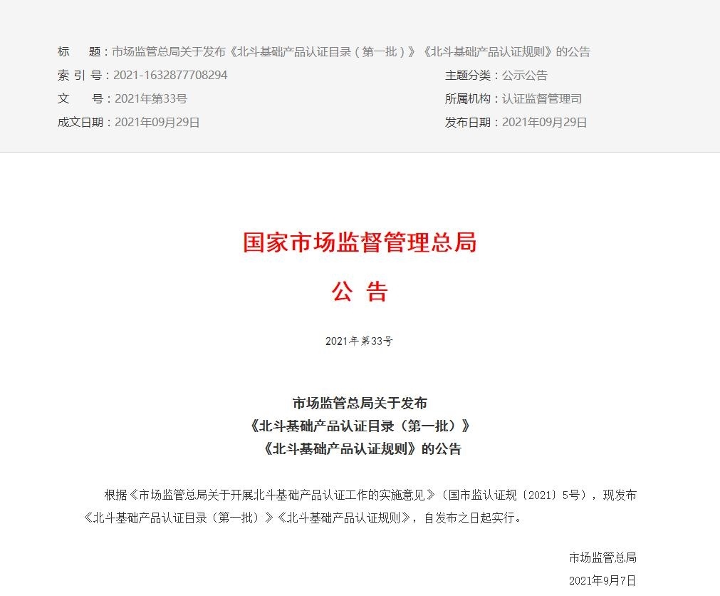 近日,國家市場監(jiān)督管理總局發(fā)布關(guān)于《北斗基礎(chǔ)產(chǎn)品認(rèn)證目錄(第一批)》、《北斗基礎(chǔ)產(chǎn)品認(rèn)證規(guī)則》公告,自發(fā)布之日起實(shí)行。