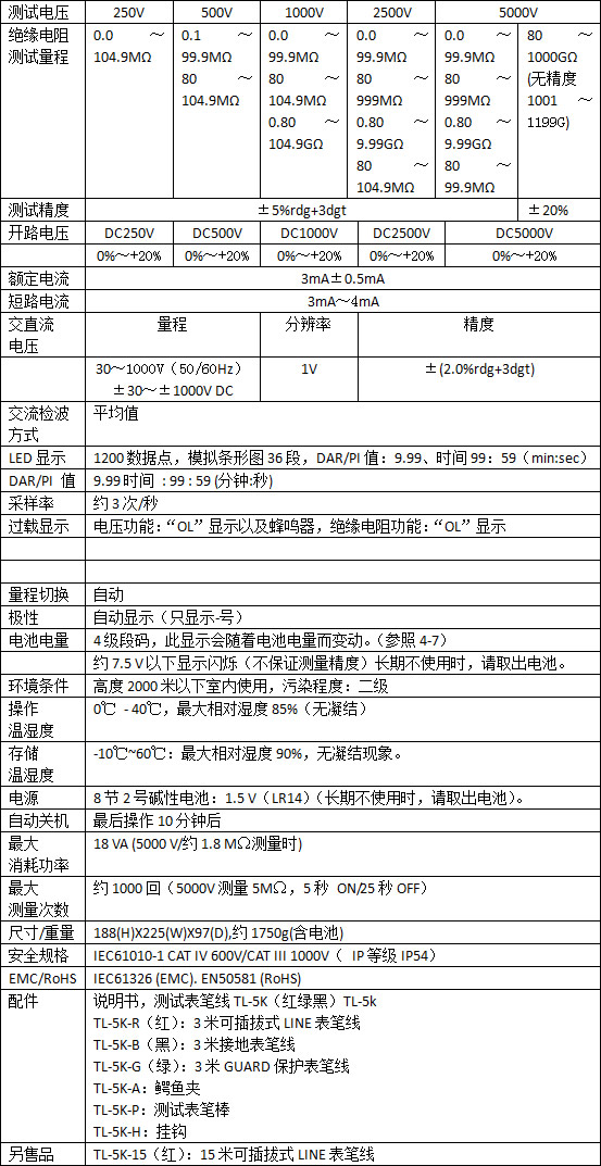 ■ 測(cè)試電壓范圍為 250V/500V/1000V/2500V/5000V