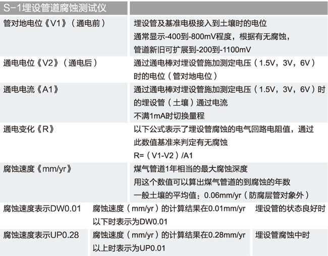 日本三和(sanwa)S-1埋設(shè)管道腐蝕測試儀是非挖開即能快速測量埋設(shè)管道的腐蝕度,可以說是對(duì)埋設(shè)管的安全管理很有幫助的常備設(shè)備。是在不挖開煤氣供給埋設(shè)管道的情況下,經(jīng)由通電棒對(duì)發(fā)生了電氣化學(xué)反應(yīng)的埋設(shè)煤氣管道通直流電流,通過測定宏電池的電阻=通電變化值(通電變化值越小,通過電流越大,腐蝕度越高)的原理來表示腐蝕的進(jìn)行度。通電變化值小于10歐姆時(shí),可能已經(jīng)發(fā)生了混凝土 土壤內(nèi)的宏電池腐蝕,需要盡早解決腐蝕問題。