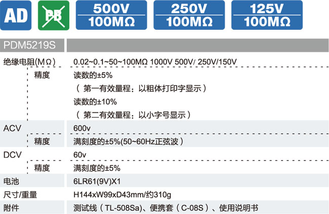 ■ 三個(gè)測試量程,測試電壓DC125V/250V/500V