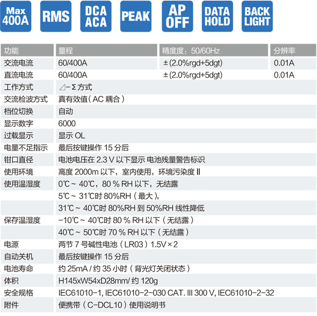 ■ 最大可測量交直流電流400A,最高分辨率0.01A
