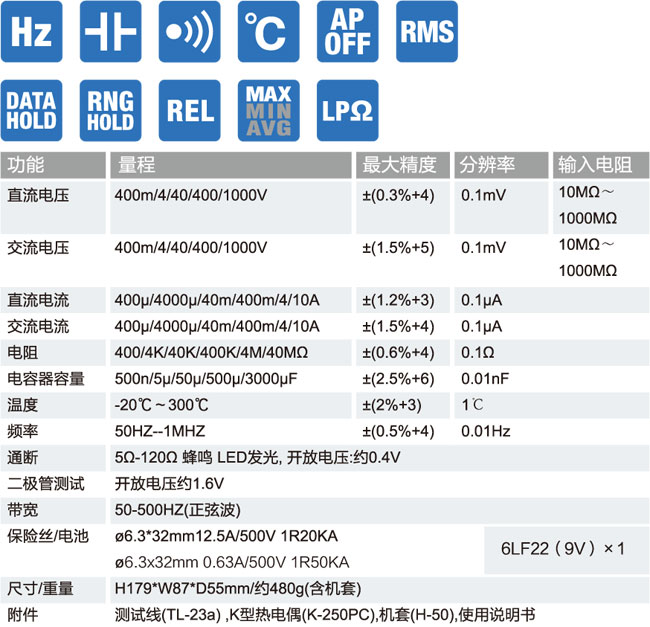 ■ 具有交直流電壓、交直流電流、電阻、電容、頻率、二極管和溫度測量功能