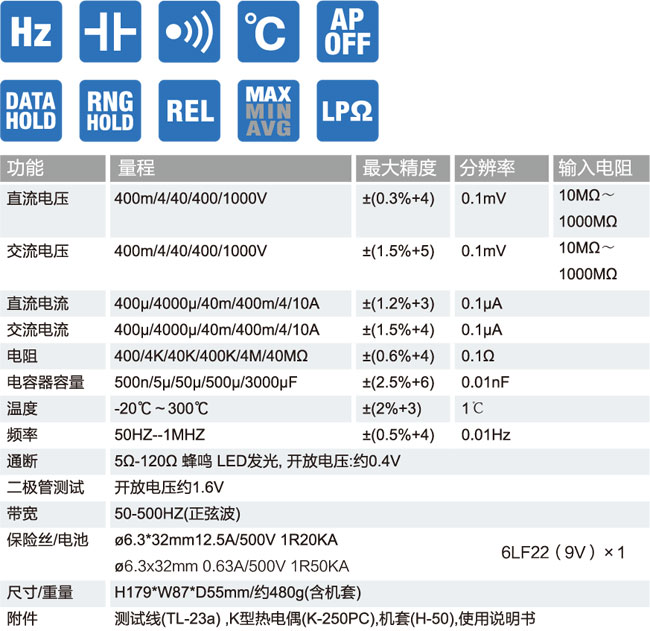 ■ 具有交直流電壓、交直流電流、電阻、電容、頻率、二極管和溫度測量功能