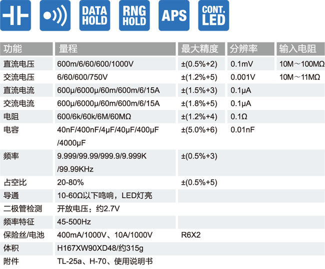 ■ 具有測試交直流電壓、交直流電流、電阻、電容、頻率、通斷、二極管檢測以及百分比表示的占空比