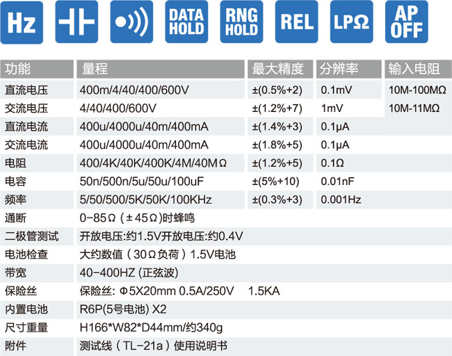 ■ 具有交直流電壓、交直流電流、通斷、電阻、二極管檢測以及頻率檢測(僅限于零交叉信號,輸入電阻約2KΩ)