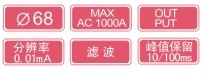 交流電流(WIDE) | 200mA/2/20/200A/1000A 200mA/2/20/200A/1000A ±1%rdg±2dgt(50/60Hz) ±1.8%rdg±5dgt(50/60Hz) ±3.0%rdg±2dgt(40~1kHz)(200mA/2/20A) ±3.0%rdg±5dgt(40~1kHz)(200mA/2/20A)±1.5%rdg±2dgt(50/60Hz) ±2.0%rdg±5dgt(50/60Hz)±3.5%rdg±2dgt(40~1kHz)(200A/0~500A) ±3.5%rdg±5dgt(40~1kHz)(200A/0~500A) ±5.0%rdg(50~60Hz) ±5.0%rdg(50~60Hz)(501~1000A) ±10%rdg(40~1kHz)(501~1000A) |