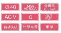 測定范圍 ? 精確度 | 交流電流(50/60Hz) | 20/200mA/2/20/200/500A ±1.5%rdg±5dgt(20/200mA/2A) ±2%rdg±5dgt(20/200A) ±2.5%rdg±5dgt(500A) |