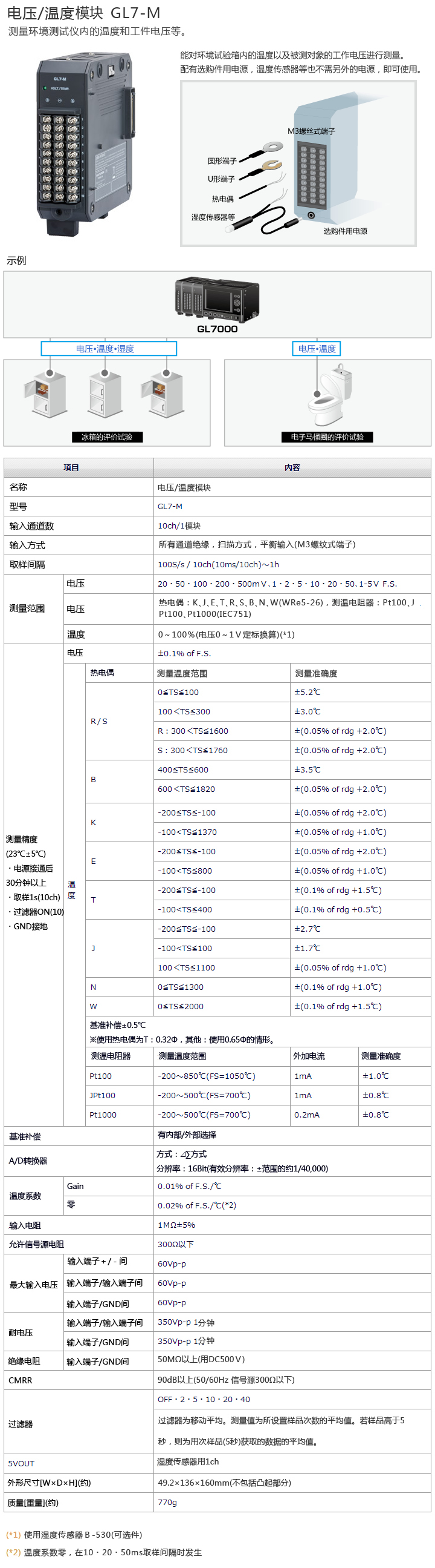 GL7-M電壓溫度模塊是一個模塊標(biāo)配10個通道,GL7-M電壓溫度模塊可以直接測量電壓和溫度信號,同時GL7-M電壓溫度模塊還具有GL7-V的所有功能。用戶可以根據(jù)需要選擇相應(yīng)的測試模塊。