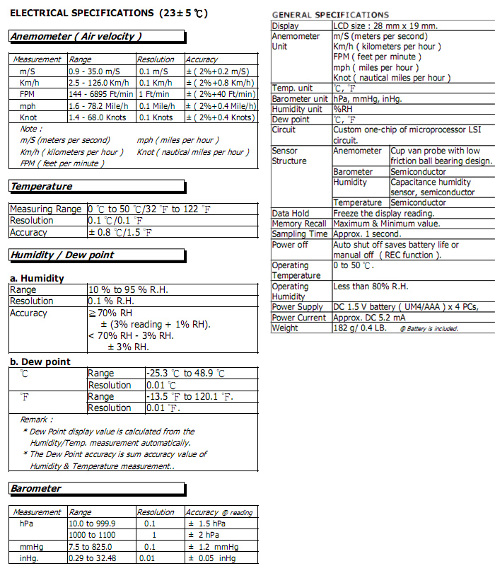 * 兩個顯示可以選擇的六個模式 (函數(shù)):濕度/溫度 / 濕度/露點(diǎn),風(fēng)速儀/溫度 / 晴雨表/Temp。晴雨表/濕度,氣壓計/風(fēng)速計,