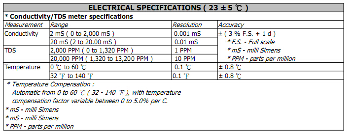 *電導率儀包括兩個范圍:: 2 mS, 20 mS. TDS 2,000 PPM, 20,000 PPM。溫度測量范圍為0 - 60 / 32 - 140℃℉
