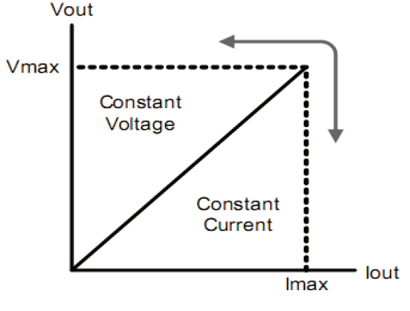 通過此功能,電源可在隨負載變化而發(fā)生的恒定電壓模式到恒定電流模式的轉換時保持不間斷操作。針對當前的負載,電源工作在恒電壓模式下,電源將提供一個受控制的輸出電壓,隨著負載電阻值的變小,輸出電壓降保持恒定,直到電流增大而受限于預設的電流值,然后發(fā)生轉換。此時電源變?yōu)槎娏鬏敵?,而輸出電壓將根據進一步的負載電阻值變小按比例降低。當電流值低于設定值時,電源返回恒電壓模式。