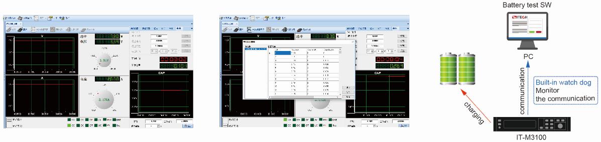 IT-M3100系列具有電池充電功能,可對(duì)電池進(jìn)行充電測(cè)試。用戶通過(guò)面板就可自行設(shè)置電池四種測(cè)試關(guān)斷條件:關(guān)斷電壓、關(guān)斷電流、關(guān)斷容量和充電時(shí)間。當(dāng)四者中任意一種條件滿足時(shí),即會(huì)自動(dòng)中斷測(cè)試。測(cè)試過(guò)程中可觀測(cè)電池的電壓、充電時(shí)間和已充電容量。同時(shí),IT9000上位機(jī)軟件配置看門(mén)狗功能,為用戶提供可靠的自動(dòng)化測(cè)試方案。