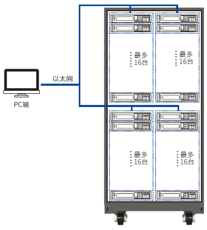 IT-M3100系列具備獨(dú)立多通道的設(shè)計(jì)架構(gòu), 16臺(tái)IT-M3100組成多通道電源系統(tǒng)后,每臺(tái)儀器界面會(huì)顯示通道號(hào)。將其中一臺(tái)電源的通訊接口與PC 端連接,可在上位機(jī)軟件中獨(dú)立控制系統(tǒng)中的每臺(tái)電源,每個(gè)通道可完全獨(dú)立操作。IT-M3100系列可達(dá)16*16通道,1個(gè)37U機(jī)柜內(nèi)就可達(dá)64通道,透過(guò)并聯(lián)功能可支持多種不同功率的待測(cè)物測(cè)試,并且使用戶的使用更為彈性,設(shè)備的使用率大幅提高。