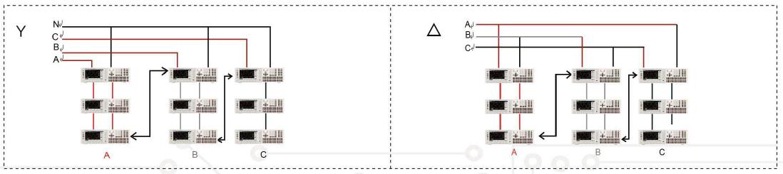 IT8600提供多臺并聯(lián)、三相與并聯(lián)三相的功能,可以實現(xiàn)對于三相交流電源或者更大功率電源的測試應(yīng)用。在三相并聯(lián)應(yīng)用中,用戶可以根據(jù)實際需求實現(xiàn)Y型和Δ型的連接方式,進行自由靈活的搭配。IT8600還可以實現(xiàn)交流380V的輸入,全球通用,滿足多元的測試需求。
