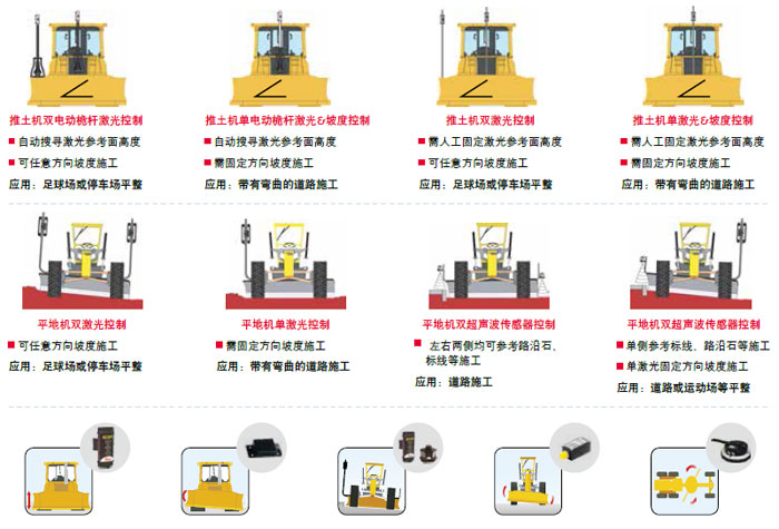 360° 激光接收器和獨特的超聲波傳感器技術(shù), 實現(xiàn)精準的自動高度和坡度控制, 借助液壓系統(tǒng)控制, 實現(xiàn)平地機鏟刀自動控制,無需操作手控制鏟刀,全新的施工方式,極大提高施工效率