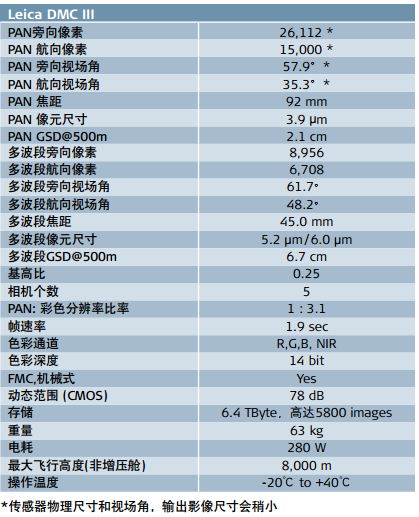 最大單片傳感器-幅寬高達26,112*像素 基于針對航空應用而專門打造的全新CMOS傳感器, Leica DMCIII航空相機提供世界上單片傳感器能夠覆蓋的最大幅寬:簡單而直接,旁向26112*像素。這比當前市面上的其他相機至少提高25%。而且,得益于它革命性的像移補償設計, Leica DMCIII將為您呈現(xiàn)單片傳感器前所未有的影像質(zhì)量和無可比擬的幾何精度。 隨著HxMAP的發(fā)布,徠卡測量系統(tǒng)為所有傳感器提供了最富創(chuàng)新性和直觀性的數(shù)據(jù)處理環(huán)境,大大提高了處理的速度和效率。 ![]() | 參數(shù)表![]() |