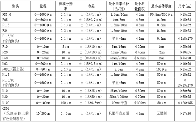 Mintest 1100-4100系列涂層測厚儀可選用測頭的技術(shù)數(shù)據(jù)