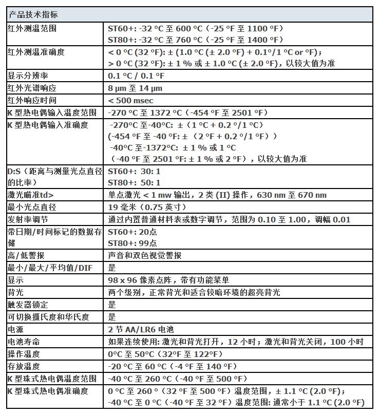 ST80+ 和 ST60+ 的特性和優(yōu)點:測量范圍: -32°C 至 760 °C /-25 °F 至 1400 °F (ST80+),或 -32°C 至 600 °C/-25°F 至 1100 °F (ST60+)借助軟鍵按鈕和點陣式顯示屏,輕松訪問高級功能可測量距離更遠(yuǎn)、體積更小的對象,D:S比率達(dá) 50:1 (ST80+) 或 30:1 (ST60+)兼容所有標(biāo)準(zhǔn)迷你接頭 K 型熱電偶,保留在熱電偶上的投資可調(diào)輻射系數(shù)功能(內(nèi)置材料表),讓用戶放心測量多種表面捕獲多個數(shù)據(jù)點(ST80+ 多達(dá) 99 個,ST60+ 多達(dá) 20 個)2 種級別的背光高度,輕松適應(yīng)各種光照條件聲音和視覺警報,及時提示用戶測量值是否超出了設(shè)定的極限值通過最小值、最大值、平均值和 DIF 功能快速識別問題隨附的 K 型熱電偶珠式探針便于立即進行接觸式測量1 % 的測量準(zhǔn)確度讓用戶放心檢修設(shè)備多功能界面有 6 種語言可供選擇 |