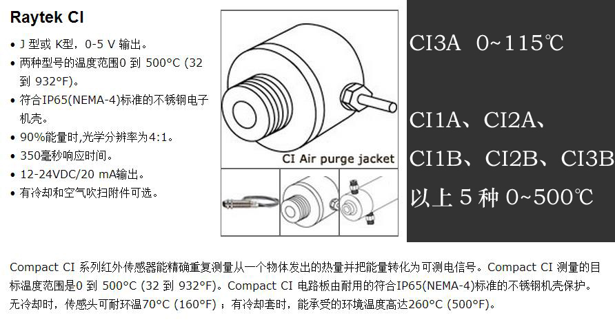 ● CI系列測溫儀專門為目標(biāo)溫度范圍為0~500℃的應(yīng)用而設(shè)計(jì)。CI電路板由耐用的符合IP65(NEMA-4)標(biāo)準(zhǔn)的不銹鋼電路盒所封閉;無冷卻時(shí),傳感頭耐環(huán)溫達(dá)70℃;有冷卻套時(shí),CI可耐環(huán)溫高達(dá)260℃。