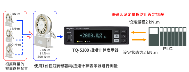 另外,配有多量程測量功能(選配功能),使得使用1臺扭矩傳感器即可通過設(shè)定對應(yīng)多段扭矩容量量程的測量使用。