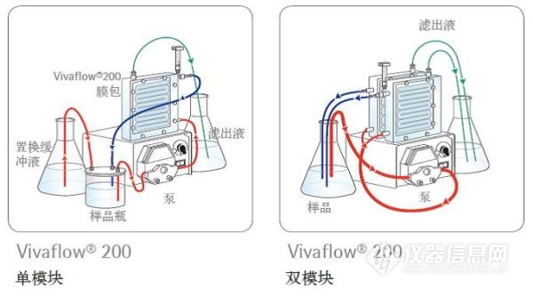 與Vivaflow? 50R相同,Vivaflow? 200是一款可重復(fù)使用的切向流膜包,可提供多種膜:改性再生纖維素Hydrosart?膜和PES膜。該膜包非常適合對病毒和抗體等昂貴的樣品進行濃縮。同樣,也可以將兩塊Vivaflow? 200膜包并聯(lián)使用,提高流速,提高樣品處理量至5L。
