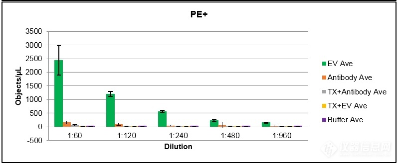 在以下研究中,分別在三臺(tái)CellStream儀器上檢測(cè)使用CD235ab-PE和CD41-APC熒光抗體標(biāo)記的紅細(xì)胞和血小板來源的EV。圖(A)顯示EV的圈門策略,利用該門識(shí)別 PE+和 APC+群體。(B)顯示濃度梯度稀釋下EV熒光散點(diǎn)分布。(C)顯示濃度梯度稀釋下EV平均熒光強(qiáng)度。(D)顯示濃度梯度稀釋下EV樣品組、抗體對(duì)照組、Triton-X 100(TX)+ 抗體對(duì)照組、TX +EV對(duì)照組以及PBS對(duì)照組的顆粒濃度對(duì)比。(E)顯示數(shù)據(jù)統(tǒng)計(jì)結(jié)果。