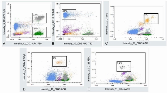 免疫分型通常用來(lái)鑒別血細(xì)胞亞群。FlowSight最多能夠同時(shí)檢測(cè)10色熒光,最大程度地滿足研究者的實(shí)驗(yàn)需求。在這個(gè)例子中,研究人員用抗CD45, CD14, CD16, CD19, CD3, CD4和 CD123的抗體以及DAPI染料對(duì)細(xì)胞進(jìn)行標(biāo)記。通過(guò)一系列設(shè)門分析,他們鑒別了以下細(xì)胞類群: (A) CD3+ T細(xì)胞, CD4+ 輔助T細(xì)胞; (B) CD16+ 粒細(xì)胞; (C) CD19+ B 細(xì)胞; (D) CD14+ 單核細(xì)胞; (E) CD123+ pDC/嗜堿性粒細(xì)胞.