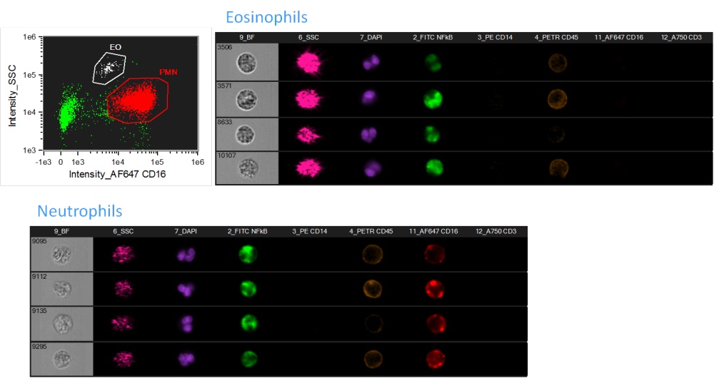 NF-κβ作為一種廣泛存在的轉(zhuǎn)錄因子,被激活由胞漿轉(zhuǎn)入胞核,從而參與炎癥反應(yīng)、免疫反應(yīng)、細(xì)胞凋亡、腫瘤發(fā)生等。可以將細(xì)胞核和NF-κβ分別用DAPI和FITC染色,F(xiàn)lowSight可觀察每個(gè)細(xì)胞是否發(fā)生 NF-κβ核轉(zhuǎn)位,并量化分析NFkB核轉(zhuǎn)位程度以及發(fā)生核轉(zhuǎn)位細(xì)胞的比例。