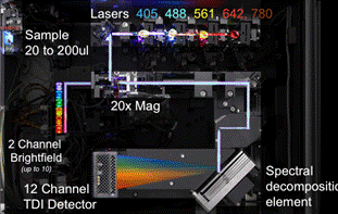 FlowSight系統(tǒng)平臺(tái)也是由液流系統(tǒng),光學(xué)系統(tǒng)和電子系統(tǒng)等三大部分組成。液流系統(tǒng)將樣本細(xì)胞懸液和系統(tǒng)鞘液注入流動(dòng)室中,使細(xì)胞在鞘液流的約束下聚焦在液流的中心,逐個(gè)流過(guò)檢測(cè)窗口。光學(xué)系統(tǒng)中光源照射通過(guò)檢測(cè)窗口的細(xì)胞,從而產(chǎn)生光信號(hào)。光源分為兩種,其一用于產(chǎn)生明場(chǎng)細(xì)胞圖像,另一種是用于產(chǎn)生熒光細(xì)胞圖像的激光器。光源照射細(xì)胞產(chǎn)生的光信號(hào)被大數(shù)值孔徑的物鏡收集,然后通過(guò)光路系統(tǒng)傳遞到由二向色鏡構(gòu)成的濾光片堆棧(Dichroic Filter Stack)。光信號(hào)在這里被分成不同波段投射到TDI CCD的相應(yīng)檢測(cè)通道上,產(chǎn)生一個(gè)明場(chǎng)細(xì)胞圖像,一個(gè)暗場(chǎng)細(xì)胞圖像(Side Scatter,SSC)及至多10個(gè)不同熒光通道的細(xì)胞圖像。FlowSight的光路系統(tǒng)能夠自動(dòng)調(diào)整焦距,并實(shí)時(shí)測(cè)定細(xì)胞運(yùn)動(dòng)速度,而其采用高端航空遙拍CCD進(jìn)行信號(hào)采集,信噪比比PMT提高10-20倍,上述這些手段保證了系統(tǒng)采集到的細(xì)胞圖像的質(zhì)量和熒光信號(hào)的靈敏度。