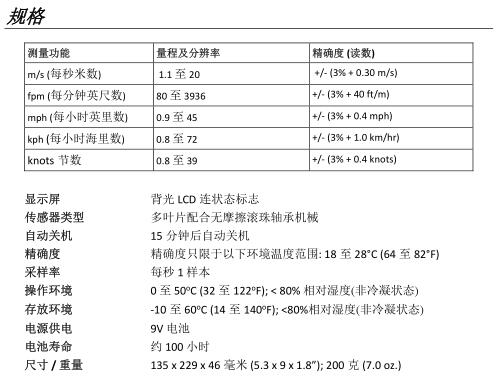 測量空氣速度:80至3936ft / min,1.1至20m / s,0.8至72km / h,0.9至45mph,0.8至39節(jié)