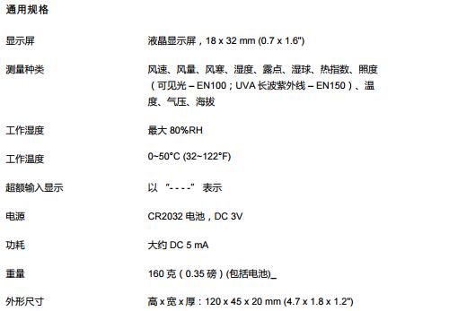 具有以下參數(shù)測量能力:風(fēng)速、風(fēng)量、風(fēng)寒、濕度、露點、濕球、熱指數(shù)、照度(可見光 –EN100)、溫度、氣壓、海拔