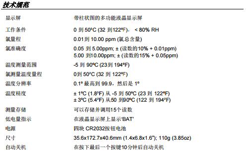 CL200 氯測試儀。CL200 是同類測量設(shè)備中的首款革新產(chǎn)品,可以直接讀取0.01 到 10.00ppm 的總氯含量。ExStik?所采用的電極方法獲得了美國環(huán)保局(EPA)批準(zhǔn),是一種廢水總氯含量達(dá)標(biāo)監(jiān)控的認(rèn)可方法。在采用這種電極方法時,在測試之前必須添加片狀試劑。CL200的使用優(yōu)點(diǎn)包括:方便使用和維護(hù)、自我校準(zhǔn)和快速響應(yīng)。CL200 可同時顯示氯含量和溫度,內(nèi)存可存儲 15 個讀數(shù)。如果精心使用和維護(hù),可保證多年的可靠服務(wù)。