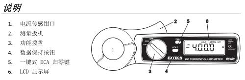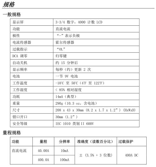 DC400是一個400安培直流迷你鉗形表。電流鉗在兩個范圍內(nèi)測量高達(dá)400安培直流,單觸自動歸零,自動關(guān)機,數(shù)據(jù)保持和高精度。配有橡膠皮套,腕帶,皮帶皮套和9V電池。