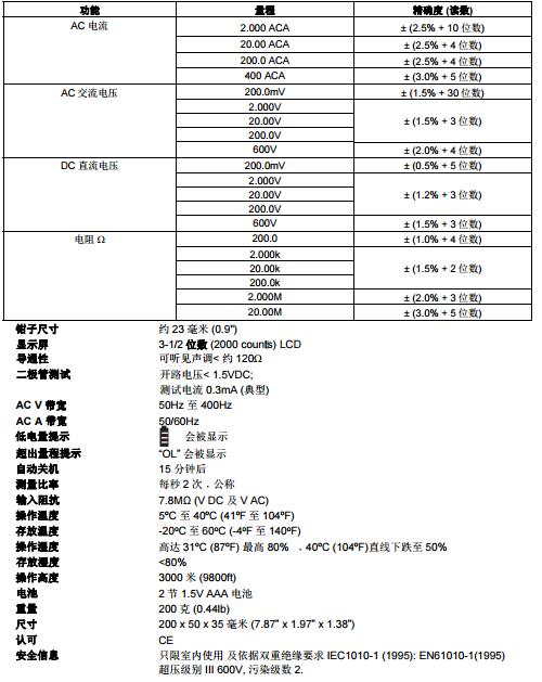 MA200緊湊型鉗表具有2,000計(jì)數(shù)LCD顯示屏,具有高精度的電流測量。它具有0.9“(23mm)鉗口尺寸,可容納高達(dá)300MCM的導(dǎo)體,該儀表具有連續(xù)性蜂鳴器和二極管測試以及數(shù)據(jù)保持功能和最大保持功能,并且MA200具有所有量程的過載保護(hù),超大范圍和低電量指示器,該Extech儀表具有自動(dòng)關(guān)閉功能,具有自動(dòng)關(guān)機(jī)功能,Extech MA200緊湊型鉗表配有測試線,手提箱和兩節(jié)AAA電池。