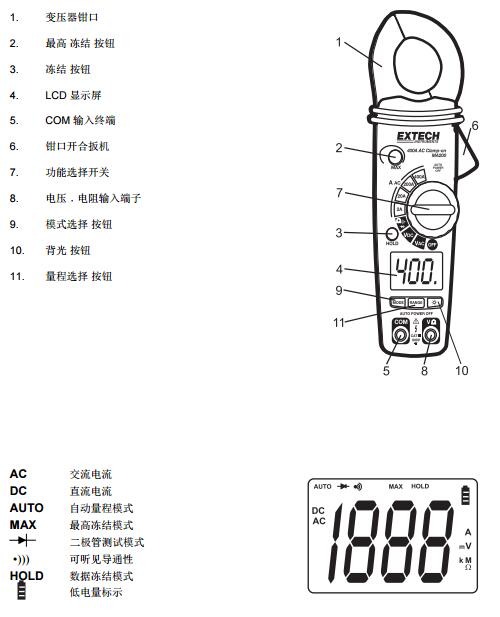 1. 設(shè)定旋轉(zhuǎn)功能開關(guān)轉(zhuǎn)至 400 或 200A 量程。若不清楚測量范圍﹐可先選擇最高量程﹐有需要才調(diào)低。