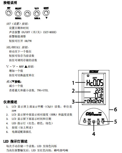 報警觸發(fā)期間,LED 將呈紅色閃爍,無論是否已選擇“蜂鳴聲關(guān)閉”。報警狀態(tài)下要想消除蜂鳴聲,請同時按 SET 和 MODE。紅色 LED 將繼續(xù)閃爍,直至環(huán)境甲醛濃度不再超過默認值,即報警值 0.08ppm 或是用戶選擇的報警值。日后使用時切記要重啟蜂鳴器。