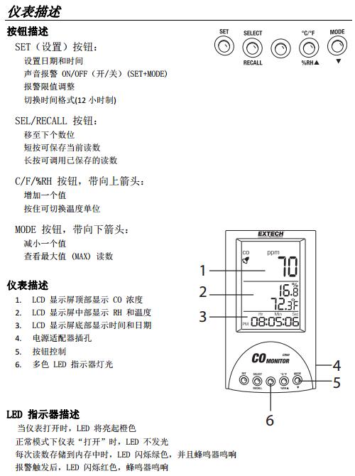 同時顯示一氧化碳(CO)濃度,空氣溫度和相對濕度讀數(shù)與日期(年,月,日)和時間