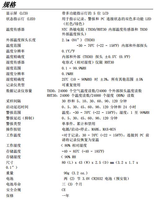 2. 數(shù)據(jù)記錄儀可連接外部溫度傳感器(僅 TH30)