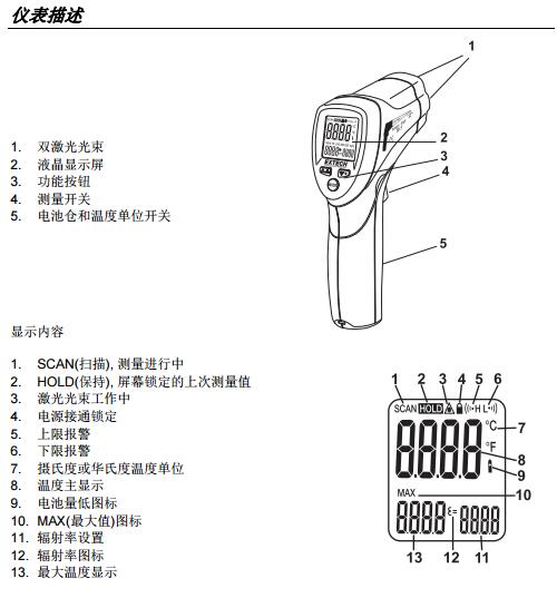 2. 拉住開關,啟動溫度計,開始測量。屏幕上將出現(xiàn)溫度讀數(shù),最大溫度讀數(shù),掃描圖標,輻射率和測量單位。
