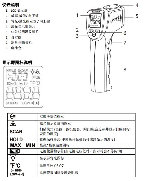4. 儀表的程序默認使用關機前的設定。例如:在關機前,激光指示器被設為開啟,而溫度單位設定為華氏﹔儀表于下一次開機后仍會使用同樣的設定