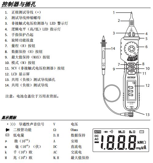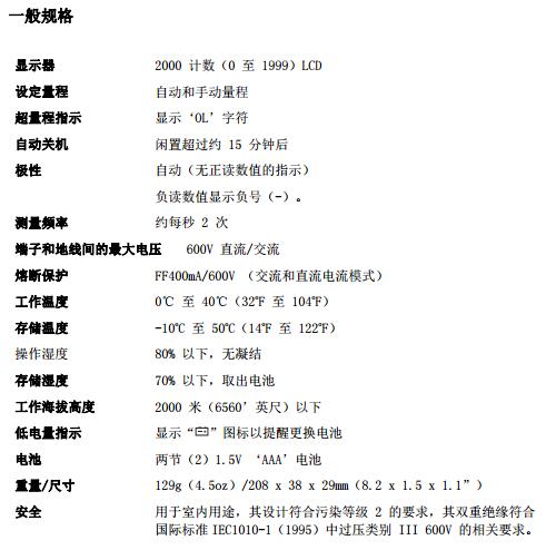 381676A 該儀表用于測量交直流電壓和電流、電阻、二極管、導通性以及邏輯電平,并內置非接觸式電壓檢測器(NCV)。其功能包括最大值保持(MAX Hold)、數(shù)據(jù)保持(Data Hold)、自動關機(APO)以及自動/手動量程(Auto/Manual Range)。該儀表在交付前均經(jīng)過全面測試及校準,只要妥善使用,您便可常年享受其可靠服務。