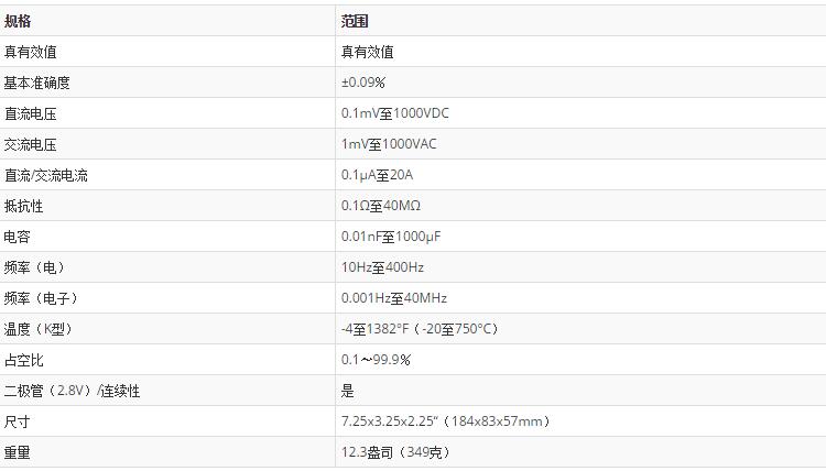 AC / DC電壓和電流,電阻,電容,頻率,溫度,占空比,二極管/連續(xù)性