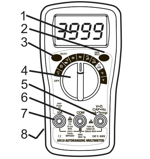 1.該電表將在大約15分鐘后自動(dòng)關(guān)閉操作。如果電表關(guān)閉, 則旋轉(zhuǎn)功能開關(guān)再次 (或按住HOLD按鈕) 恢復(fù)操作。