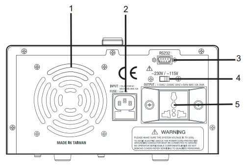 2. 電源輸入:外部電源的輸入插口(有 10A 的保險(xiǎn)絲)。輸入是可選擇的(110V 或220V),必須匹配電源開關(guān)所選的電壓。