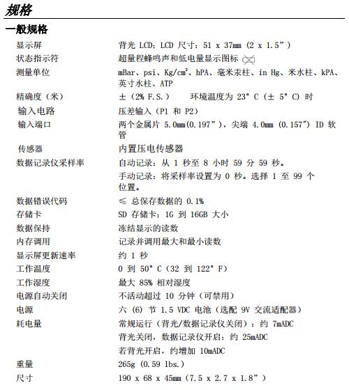 SDL710 型壓力計(jì)。該設(shè)備測(cè)量壓力表和±2.9 psi 范圍內(nèi)的壓差。支持的測(cè)量單位包括 mbar、psi、Kg/cm2、毫米汞柱、英寸汞柱、米水柱、英寸水柱、標(biāo)準(zhǔn)大氣壓力、hPA 及 kPA。記錄的數(shù)據(jù)讀數(shù)保存在 SD 卡中,以便傳輸?shù)?PC。該儀表在交付前均經(jīng)過(guò)完整測(cè)試及校準(zhǔn),若使用得當(dāng),可提供多年可靠的服務(wù)。