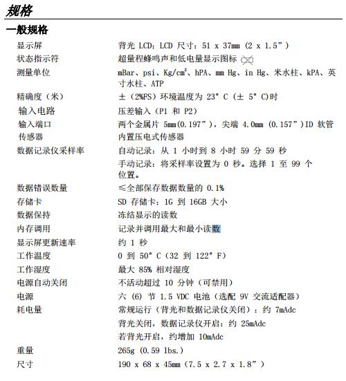 SDL720 型壓力計(jì)。該設(shè)備測(cè)量壓力表和±29 psi 范圍內(nèi)的壓差。支持的測(cè)量單位包括 bar、psi、Kg/cm2、毫米汞柱、英寸汞柱、米水柱、英寸水柱、標(biāo)準(zhǔn)大氣壓力、hPA 及 kPA。記錄的數(shù)據(jù)讀數(shù)保存在 SD 卡中,以便傳輸?shù)?PC。該儀表在交付前均經(jīng)過(guò)完整測(cè)試及校準(zhǔn),只要妥善使用,您便可常年享受其可靠服務(wù)。