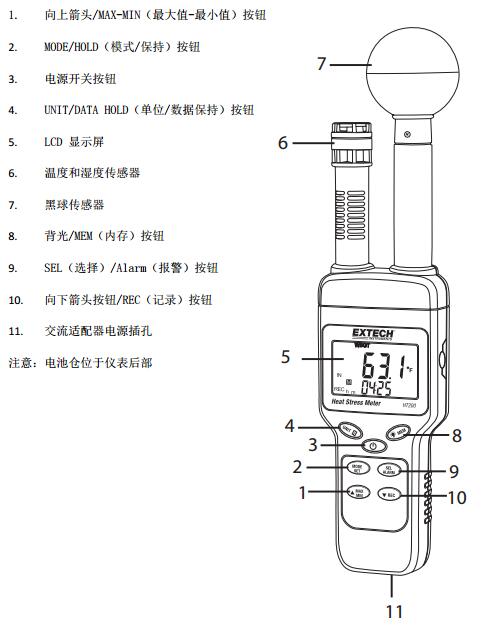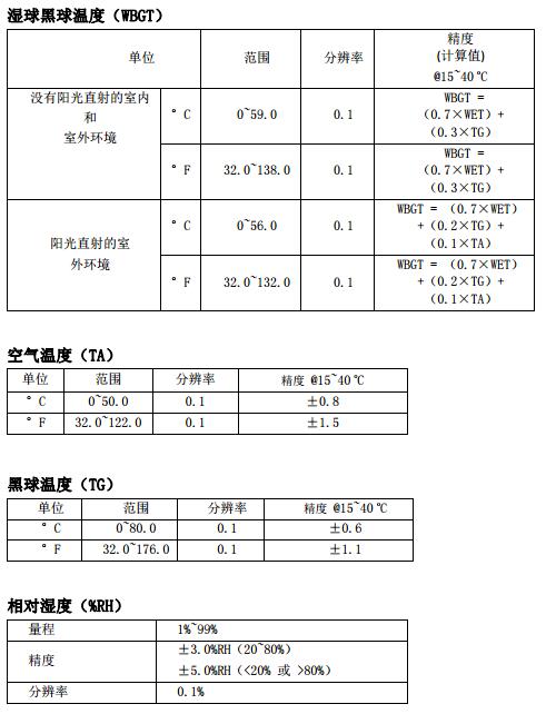 可準確測量:濕球黑球溫度(WBGT)、黑球溫度(TG)、濕度(%RH)、空氣溫度(TA)、濕球(WET)以及露點(DEW)