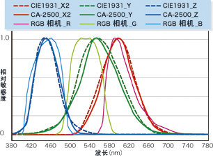二維色彩分析儀CA-2500使用XYZ濾鏡(該濾鏡具備與CIE 1931等色函數(shù)非常接近的光譜敏感度),與數(shù)碼攝像機等設(shè)備中所使用的RGB分色濾鏡相比,能夠測量與人眼感光度相近的亮度和色度。